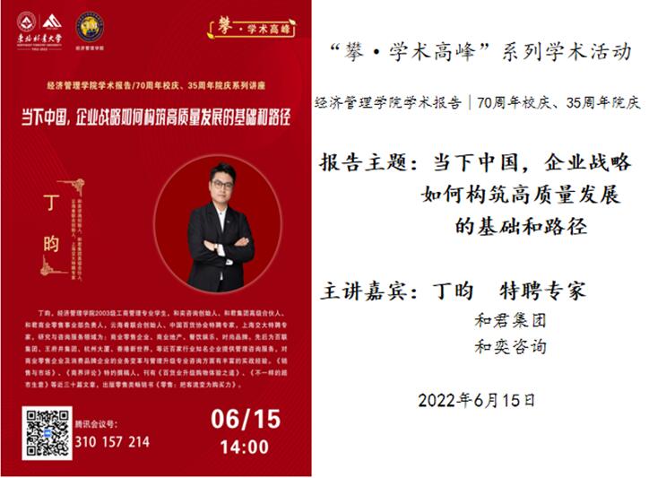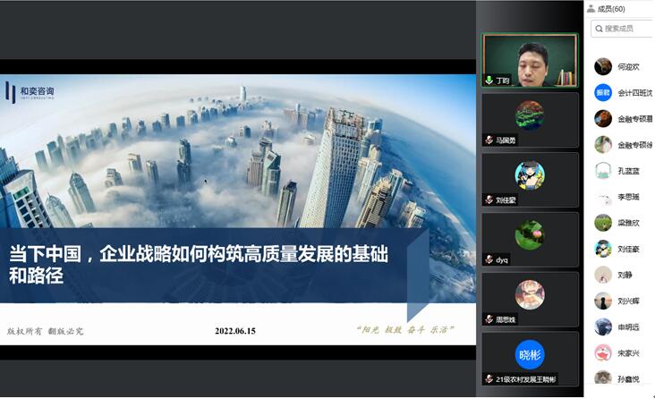 2022年6月15日下午,304am永利集团官网通过腾讯会议,借助云端成功举办了迎接建校70周年华诞之“攀·学术高峰”系列学术活动的学术报告。报告人为永利集团官网2003级工商管理专业学生丁昀,和奕咨询创始人、和君集团高级合伙人、云海肴联合创始人、中国百货协会特聘专家,上海交大特聘专家。